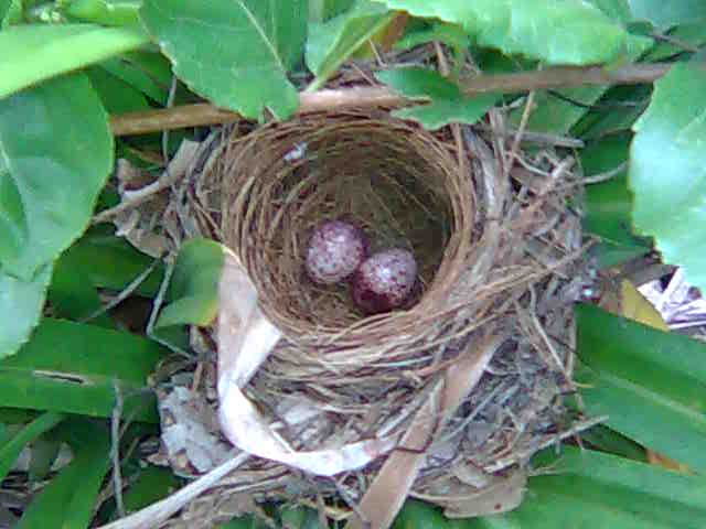 Subhanallah.Cantik sungguh.Telur burung (tak tau nama) dalam sarang di celah pokok pandan belakang rumah.Warna ungu kemerah-merahan.
